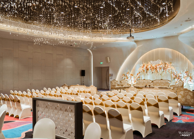 จุดเด่นของห้องอยู่ที่การออกแบบภายในที่ช่วยให้ภาพรวมของงานดูโปร่งและกว้างกว่าขนาดจริง ทำให้เวลาถ่ายภาพออกมาแล้วงานดูยิ่งใหญ่และสวยงาม โดดเด่นด้วยแชนเดอเลียร์คริสตัลรูปดอกกุหลาบที่สะท้อนแสงระยิบระยับ เพิ่มมิติและความโรแมนติกให้กับบรรยากาศภายในงานได้อย่างลงตัว ผสานกับโทนสีพรมที่ช่วยเติมความสดใส ทำให้ภาพถ่ายทุกมุมออกมาดูสมบูรณ์แบบ