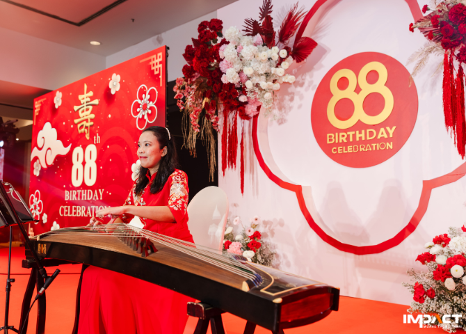 บรรยากาศของงานเลี้ยงฉลองวันคล้ายวันเกิดถูกออกแบบภายใต้ ธีมงานมงคลแบบจีน สะท้อนความรักและคำอวยพรจากลูกหลาน และธีมงานยังถูกออกแบบในโทนสีแดง ชมพู และทอง ซึ่งเป็นสีมงคลที่มีความหมายดีตามความเชื่อของชาวจีน