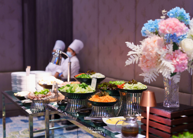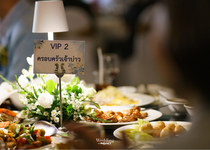 - โต๊ะอาหารถูกจัดวางอย่างเป็นระเบียบ เสิร์ฟเมนูพิเศษที่คุณเลือกไว้ในแพ็กเกจแต่งงาน เพื่อแบ่งปันรสชาติแห่งความสุขให้แขกทุกท่าน
