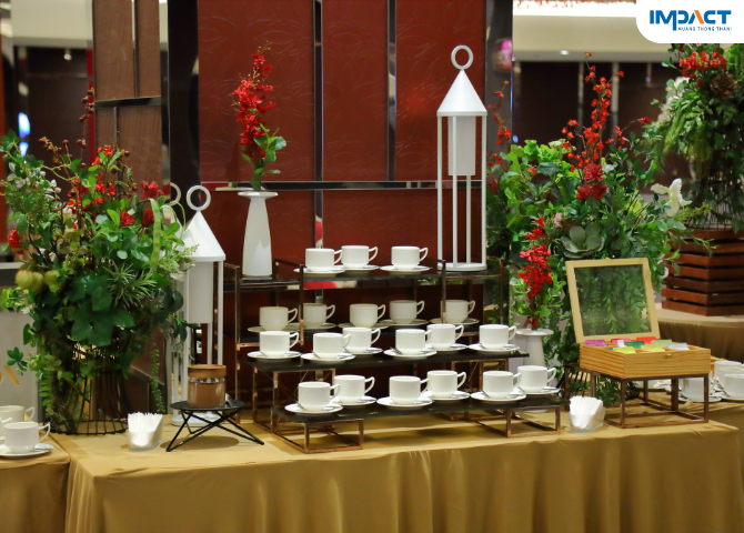 อิมแพ็ค เมืองทองธานี ให้บริการจัดเลี้ยงภายในสถานที่โดยทีมงานมืออาชีพ ดูแลครบทุกขั้นตอนตั้งแต่การออกแบบเมนูไปจนถึงการจัดเรียงอาหารหน้างาน เพื่อให้ผู้เข้าร่วมประชุมรู้สึกประทับใจและใช้งานได้อย่างสะดวกสบาย สำหรับชุดอาหารว่างช่วงพักประชุม (คอฟฟี่เบรก) เรามีเมนูให้เลือกมากมาย และสามารถปรับรูปแบบให้เหมาะกับลักษณะของงานได้ เช่น หากเป็นการประชุมเร่งด่วนหรือมีจำนวนแขกค่อนข้างมาก การจัด Coffee Break แบบกล่อง (Grab & Go) จะช่วยลดความแออัดและทำให้ผู้ร่วมงานได้รับบริการอย่างรวดเร็ว ในขณะที่รูปแบบตั้งเป็นแบบสเตชั่น (Station) จะเหมาะกับช่วงพักผ่อนหรือแลกเปลี่ยนความคิดเห็นของผู้เข้าประชุม เพราะสามารถเลือกหยิบเองได้อย่างอิสระและมีพื้นที่สำหรับการพูดคุยเพิ่มเติม