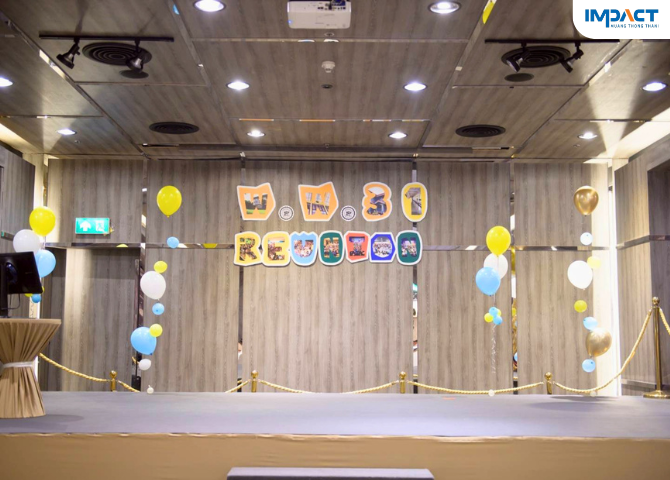 ในตอนแรกพวกเราคิดจะจัดงานที่บริเวณทะเลสาบเมืองทองธานี แต่เมื่อดูจำนวนแขกที่คาดว่าจะมาร่วมงานแล้ว พื้นที่อาจไม่เพียงพอ จึงตัดสินใจเปลี่ยนมาจัดในห้องจัดเลี้ยงของอิมแพ็ค เมืองทองธานีแทน ซึ่งตอบโจทย์ทั้งเรื่องพื้นที่และความสะดวกสบายมากกว่า และเมื่อได้เข้ามาชมสถานที่ที่อิมแพ็ค ก็รู้สึกว่าที่นี่เหมาะสมกับการจัดงานรวมรุ่นของพวกเราอย่างมาก